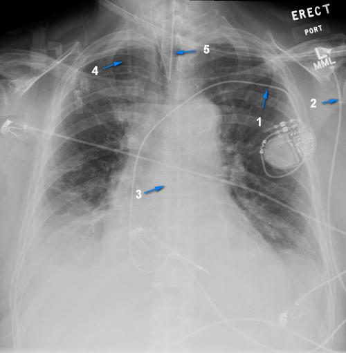 Match the following tubes, lines, and devices with the highlighted structures on the X-ray.